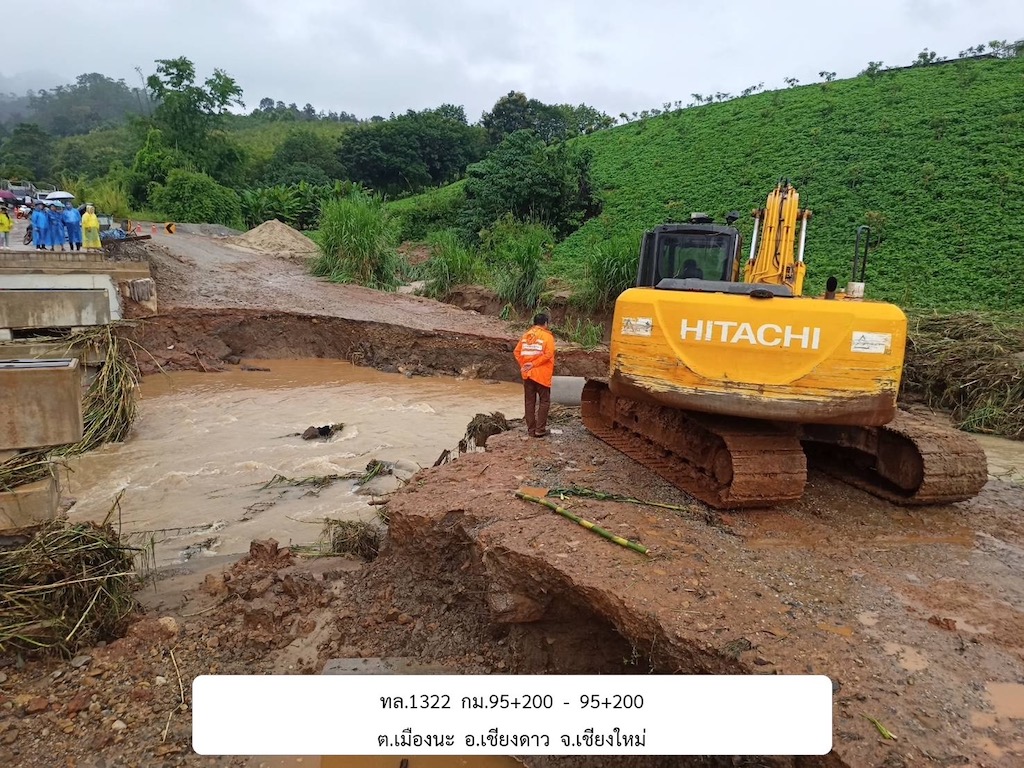 2.จ.นครสวรรค์ จำนวน 1 แห่ง เส้นทาง ทล.1 บ้านหว้า – วังไผ่ ช่วงกม.ที่ 339+450 – 339+500 อ.เมืองนครสวรรค์ ระดับน้ำ 113 ซม. ควรใช้เส้นทางหลัก 4. จ.เชียงใหม่ จำนวน 2 แห่ง เส้นทาง ทล.1322 แม่จา – รินหลวง ช่วงกม.ที่ 95+200 – 95+200 อ.เชียงดาว ระดับน้ำ 10 ซม. ทางเบี่ยงขาดไม่มีทางเลี่ยง, เส้นทาง ทล.1322 แม่จา– รินหลวง ช่วงกม.ที่ 126+900 – 126+950 อ.เชียงดาว ระดับน้ำ 60 ซม. เข้าถนนหมู่บ้านหนองเขียว ไปทล.1178 ตอนนาหวาย-สินไชย ออกที่ กม.36+600 3.จ.พระนครศรีอยุธยา จำนวน 1 แห่ง เส้นทาง ทล.32 นครหลวง – อ่างทอง ช่วงกม.ที่ 32+450 – 32+550 อ.บางปะหัน ระดับน้ำ 120 ซม. มีทางจุดกลับต่างระดับบางปะหันอีก 1 กม. 6. จ.ตาก จำนวน 1 แห่ง เส้นทาง ทล.1 ตาก – วังม่วง ช่วงกม.ที่ 533+340 – 533+345 อ.เมืองตาก ระดับน้ำ 35 ซม. ใช้ยูเทิร์นถัดไป