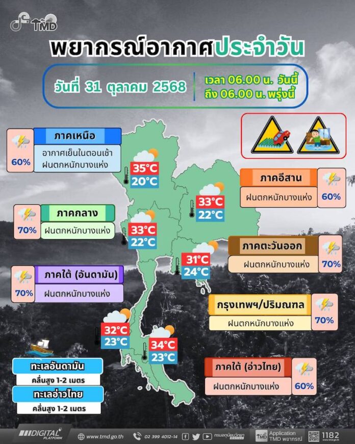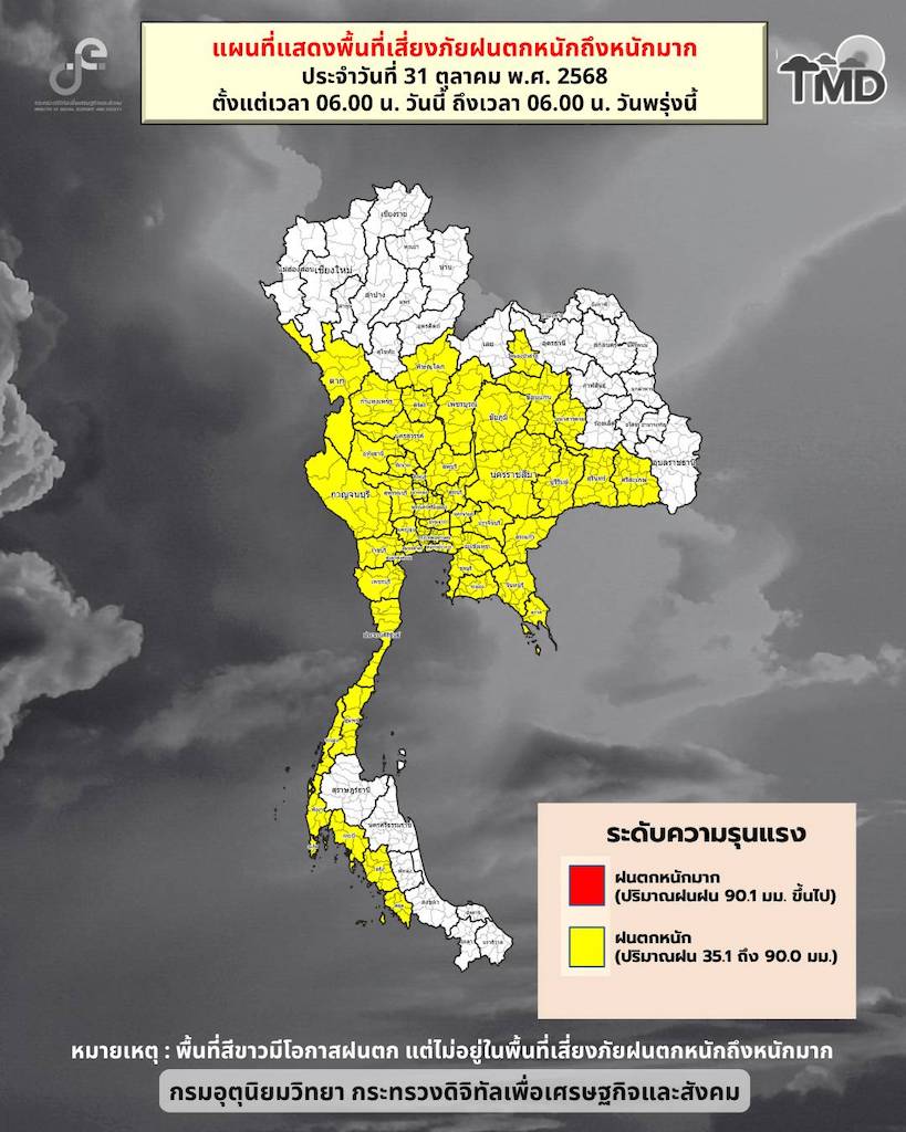 กรมอุตุนิยมวิทยา พยากรณ์อากาศ 24 ชั่วโมงข้างหน้า ตั้งแต่วเลา 06:00 น. วันนี้(31ต.ค.68) ถึง 06:00 น. วันพรุ่งนี้ (1พ.ย.68) ประเทศไทยมีฝนเพิ่มขึ้น และมีฝนตกหนักบางแห่ง โดยเฉพาะจังหวัดนครสวรรค์ อุทัยธานี ชัยนาท สุพรรณบุรี ลพบุรี สระบุรี เพชรบุรี ประจวบคีรีขันธ์ ชุมพร และระนอง แต่ยังคงมีอากาศเย็นในตอนเช้าบริเวณภาคเหนือ เนื่องจากมีหย่อมความกดอากาศต่ำกำลังแรงปกคลุมบริเวณอ่าวไทยตอนบน ประกอบกับมีแนวพัดสอบของลมตะวันออกและลมตะวันออกเฉียงใต้พัดปกคลุมภาคเหนือ ในขณะที่บริเวณความกดอากาศสูงหรือมวลอากาศเย็นกำลังอ่อนปกคลุมประเทศไทยตอนบน ขอให้เกษตรกรเตรียมการป้องกันและระวังความเสียหายที่จะเกิดต่อผลผลิตทางการเกษตร รวมทั้งดูแลรักษาสุขภาพเนื่องจากสภาพอากาศที่เปลี่ยนแปลง เพิ่มความระมัดระวังในการสัญจรผ่านบริเวณที่มีฝนตก และระวังอันตรายจากฝนตกหนัก ซึ่งอาจทำให้เกิดน้ำท่วมได้ในบางพื้นที่