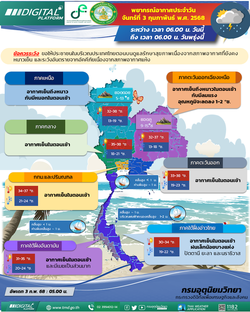 กรมอุตุนิยมวิทยา ได้พยากรณ์อากาศ 24 ชั่วโมงข้างหน้า ตั้งแต่ 06.00 น.วันนี้ (วันนี้ 3 ก.พ.68) ถึง 06.00 น.ของวันที่ 4 ก.พ.68 โดยบริเวณความกดอากาศสูงหรือมวลอากาศเย็นกำลังปานกลางระลอกใหม่จากประเทศจีนได้แผ่ลงมาถึงประเทศเวียดนามตอนบนแล้ว คาดว่าจะแผ่ลงมาปกคลุมตะวันออกเฉียงเหนือตอนบนของประเทศไทย ลักษณะเช่นนี้ทำให้ภาคตะวันออกเฉียงเหนือมีอุณหภูมิลดลงกับมีลมแรงก่อน ส่วนภาคเหนือจะได้รับผลกระทบในวันถัดไป โดยภาคเหนือ และภาคตะวันออกเฉียงเหนือมีอากาศเย็นถึงหนาว ส่วนภาคกลาง รวมทั้งกรุงเทพมหานครและปริมณฑล ภาคตะวันออก และภาคใต้มีอากาศเย็นในตอนเช้า สำหรับบริเวณยอดดอยมีอากาศหนาวถึงหนาวจัด และยอดภูมีอากาศหนาว ขอให้ประชาชนในบริเวณดังกล่าวดูแลรักษาสุขภาพเนื่องจากสภาพอากาศที่ยังคงหนาวเย็น และระวังอันตรายจากอัคคีภัยเนื่องจากสภาพอากาศแห้ง