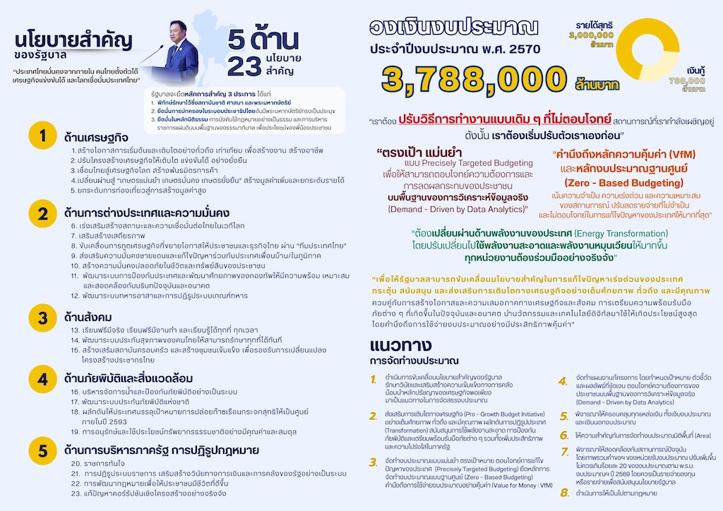 - ด้านการบริหารภาครัฐ มุ่งปฏิรูปกฎหมายให้ภาครัฐมีประสิทธิภาพสูงสุดเป็น “ราชการทันใจ” และแก้ปัญหาคอร์รัปชันเชิงโครงสร้างอย่างจริงจัง ผ่านนโยบาย “AI พลัส” และ “ไทยแลนด์ พลัส”