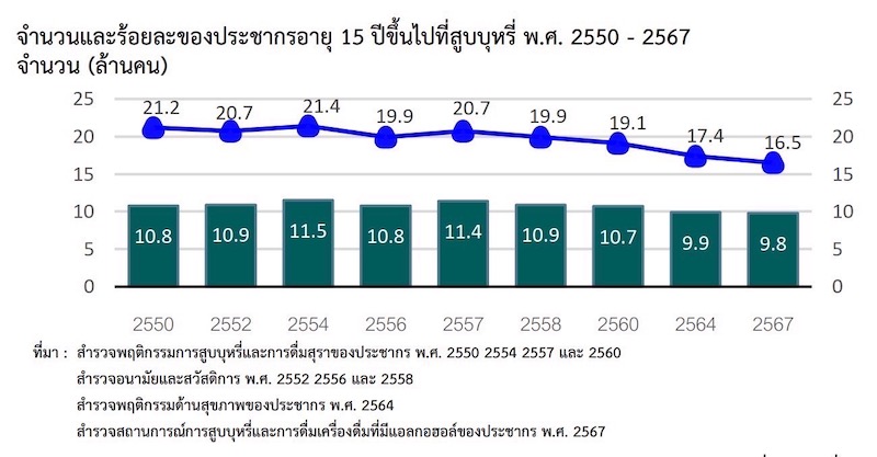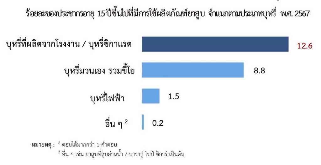 โดยจำนวนผู้สูบบุหรี่ในภาพรวมของประเทศไทยมีแนวโน้มลดลงอย่างต่อเนื่อง มีผู้สูบบุหรี่ทั้งสิ้น 9.8 ล้านคน คิดเป็นร้อยละ 16.5 ของประชากรอายุ 15 ปีขึ้นไป ในปี 2567 ลดลงจากร้อยละ 17.4 ในปี 2564 ทั้งนี้ ประเภทของบุหรี่ที่ผู้สูบนิยมสูบมากที่สุดคือ บุหรี่โรงงาน (ร้อยละ 12.6) สำหรับประเด็นที่น่าจับตามองคือ “บุหรี่ไฟฟ้า” ที่มีผู้สูบคิดเป็นร้อยละ 1.5 หรือประมาณ 0.90 ล้านคน