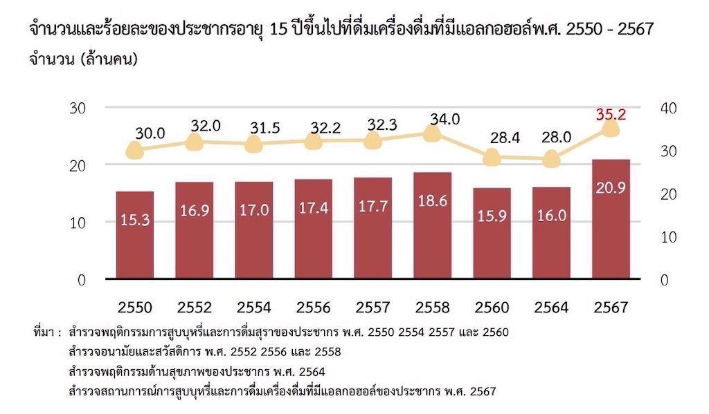 ส่วนจำนวนผู้ดื่มเครื่องดื่มที่มีแอลกอฮอล์กลับมีแนวโน้มเพิ่มขึ้น โดยในปี 2567 มีผู้ดื่ม ถึง 20.9 ล้านคน คิดเป็นร้อยละ 35.2 ของประชากรอายุ 15 ปีขึ้นไป ซึ่งเพิ่มจาก 16.0 ล้านคน หรือร้อยละ 28.0 ในปี 2564 เมื่อพิจารณาถึงประเภทของเครื่องดื่มแอลกอฮอล์ที่ดื่มบ่อยที่สุด พบว่า เบียร์และคราฟเบียร์เป็นเครื่องดื่มที่ได้รับความนิยมสูงสุด (ร้อยละ 58.3) รองลงมาเป็น สุราขาว/สุรากลั่นชุมชน/เหล้าจีน/ยาดองเหล้า/เหล้าบ๊วย (ร้อยละ 24.2) และสุราสี/สุราแดง (ร้อยละ 14.5)