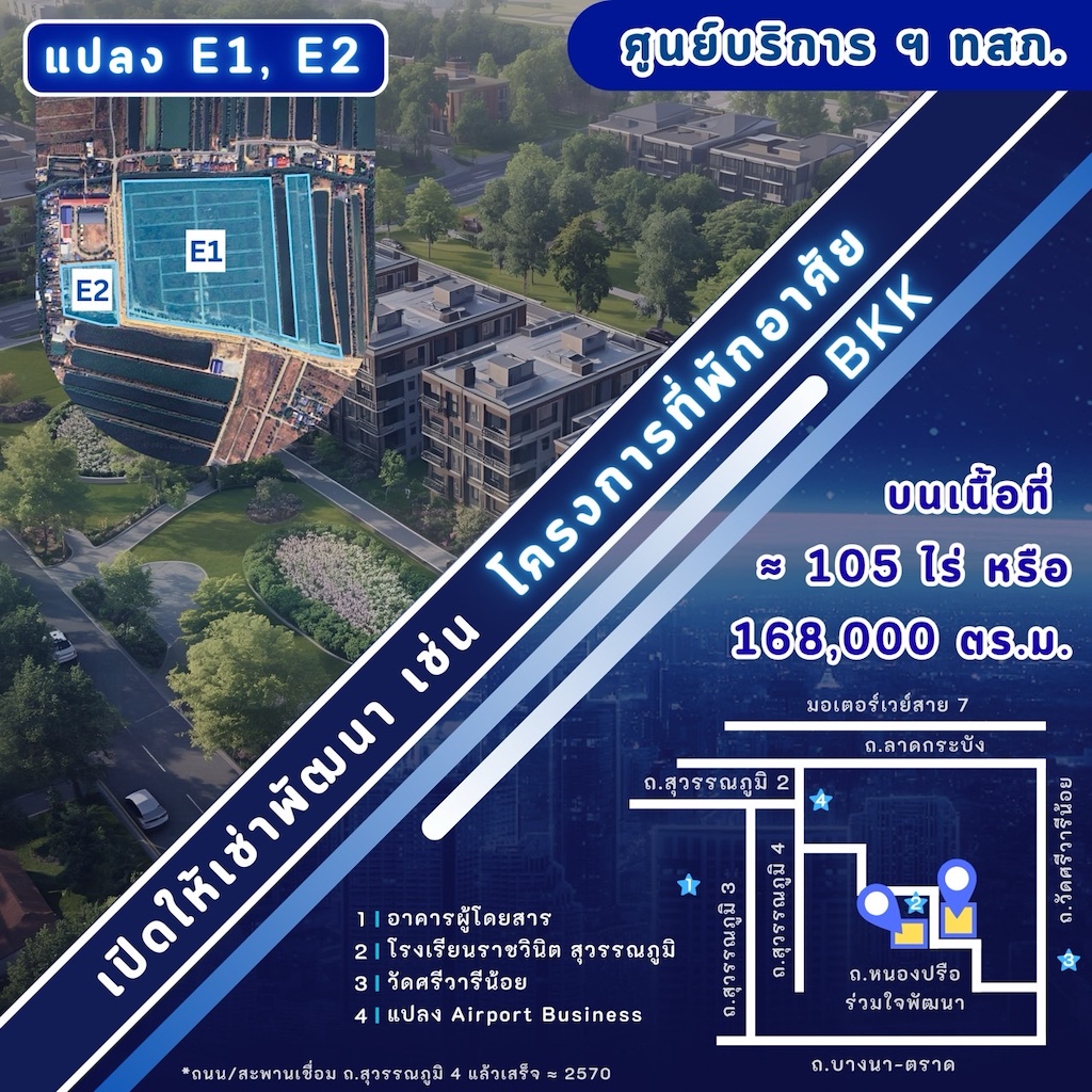 อย่างไรก็ตาม ทอท. ยังมีพื้นที่ศักยภาพสูงอีกจำนวนมากที่พร้อมเปิดให้เอกชนร่วมลงทุนและพัฒนา เพื่อรองรับการขยายตัวของอุตสาหกรรมการบิน การท่องเที่ยว และบริการต่อเนื่องในอนาคต โดยแต่ละสนามบินมีจุดเด่นเฉพาะพื้นที่ที่เหมาะสมกับการพัฒนาเชิงธุรกิจ ดังนี้ ท่าอากาศยานสุวรรณภูมิ มีพื้นที่เด่น ได้แก่ ที่ดิน Airport Business แปลง B ขนาด 275 ไร่ ตั้งอยู่ภายในพื้นที่ท่าอากาศยาน ติดถนนหลัก เดินทางถึงอาคารผู้โดยสารได้ภายใน 9 นาที เหมาะสำหรับพัฒนาโครงการขนาดใหญ่ เช่น ศูนย์ธุรกิจ โรงแรม หรือคอมเพล็กซ์เชิงพาณิชย์ ที่ดินศูนย์บริการและสนับสนุนกิจการท่าอากาศยานสุวรรณภูมิ แปลง E ขนาด 105 ไร่ ซึ่งสามารถพัฒนาเป็นศูนย์บริการด้านโลจิสติกส์หรือกิจกรรมสนับสนุนการดำเนินงานสนามบิน