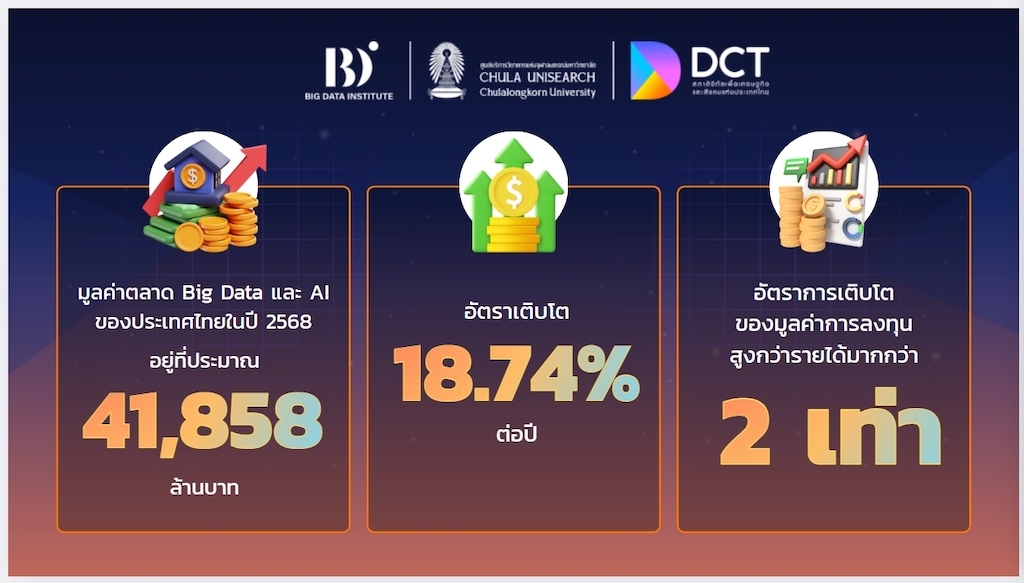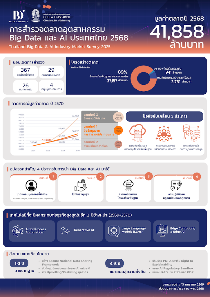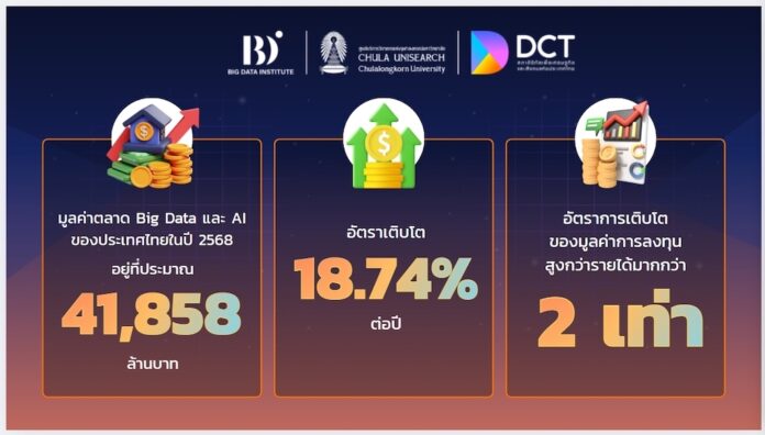 ศ. ดร.ธีรณี อจลากุล ผู้อำนวยการสถาบันข้อมูลขนาดใหญ่ (BDI) เปิดเผยว่า หรือ BDI ร่วมกับศูนย์บริการวิชาการแห่งจุฬาลงกรณ์มหาวิทยาลัย เปิดเผยผลการสำรวจตลาดอุตสาหกรรม Big Data และ AI ของ ไทย ประจำปี 2568 พบ มูลค่าตลาดพุ่งแตะ 41,858 ล้านบาท เติบโตต่อเนื่องจากปีก่อนหน้า18%