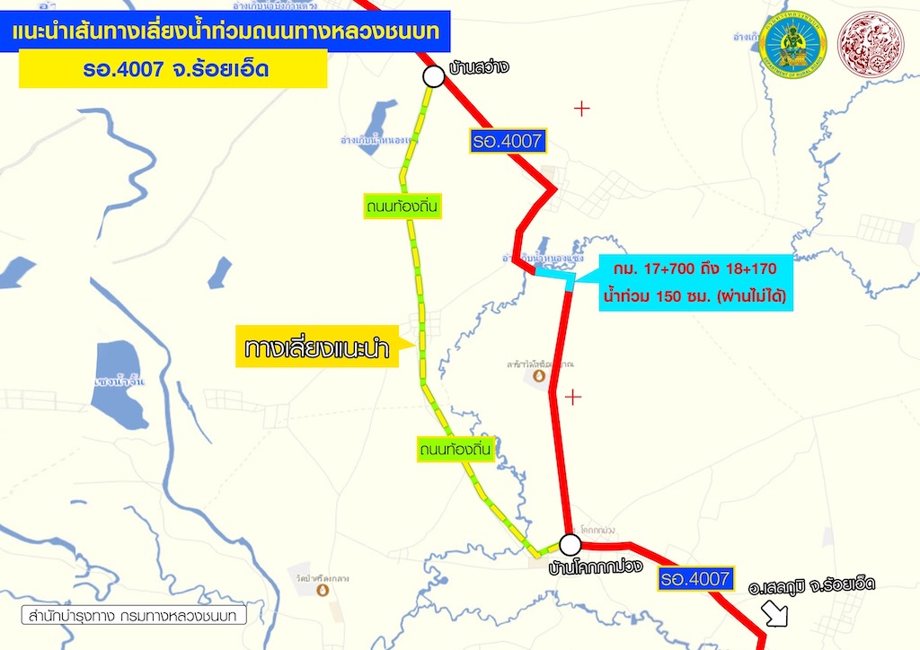นายพิชิต กล่าวต่อว่า จากการสำรวจพบว่ามีถนนทางหลวงชนบทเสียหายจำนวน มาก ทาง ทช.ขอแนะนำเส้นทางเลี่ยง 7 สายทาง ประกอบด้วย1. ถนนทางหลวงชนบทสาย รอ.4007 แยก ทล.2259 (กม.ที่ 19+400) – บ้านสว่าง อ.เสลภูมิ, โพนทอง จ.ร้อยเอ็ด ซึ่งหากต้องการเดินผ่านบริเวณน้ำท่วมให้ผู้ใช้ทางเลี้ยวบริเวณบ้านโคกกกม่วงพัฒนา (ถนนทางหลวงชนบทสาย รอ.4007 กม.ที่ 14+500) ขับบนถนน อบจ. ไปยังบ้านคำอุปราช และเข้ายังตำบลสว่าง ระยะทาง 7.200 กิโลเมตร จะสามารถเดินทางกลับมายังถนนทางหลวงชนบทสาย รอ.4007 (กม.ที่ 22+000)