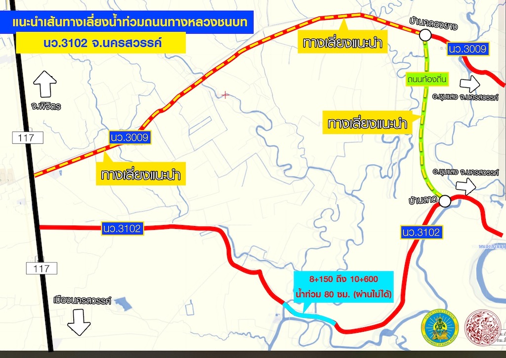 3. ถนนทางหลวงชนบทสาย นว.3102 แยก ทล.117 (กม.ที่ 16+150) – บ้านเนิน อ.เก้าเลี้ยว, ชุมแสง จ.นครสวรรค์ ซึ่งหากต้องการเดินทางจาก กม.ที่ 0+000 ของถนนสายดังกล่าว และต้องการข้ามผ่านบริเวณน้ำท่วม ให้ผู้ใช้รถใช้ถนนเดินทางย้อนกลับไปยัง ทล.117 มุ่งหน้าเข้าถนนทางหลวงชนบทสาย นว.3009 กม.ที่ 0+000 เดินทางจนถึง กม.ที่ 9+800 จากนั้นให้ใช้แยกเข้าถนนท้องถิ่น ระยะทาง 7.500 กิโลเมตร จะสามารถเดินกลับมายังถนนทางหลวงชนบทสาย นว.3102 และหลีกเลี่ยงบริเวณน้ำท่วมได้