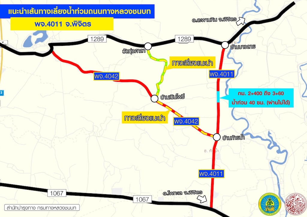 4. ถนนทางหลวงชนบทสาย พจ.4011 แยก ทล.1289 (กม.ที่ 10+900) – บ้านทุ่งอ่างทอง อ.โพทะเล จ.พิจิตร ซึ่งหากต้องการเดินทางไป อำเภอโพทะเล วิ่งบน ทล.1289 ไปอีก 5 กิโลเมตร เลี้ยวซ้ายเข้าถนนทางหลวงชนบทสาย พจ.4042 แยก ทล.1289 บ้านท้ายน้ำ หากต้องการข้ามผ่านบริเวณน้ำท่วม ให้ผู้ใช้รถใช้ถนนเดินทางย้อนมุ่งหน้าเข้าถนนทางหลวงชนบทสาย พจ.4011 เดินทางไปอำเภอโพทะเล และหลีกเลี่ยงบริเวณน้ำท่วมได้