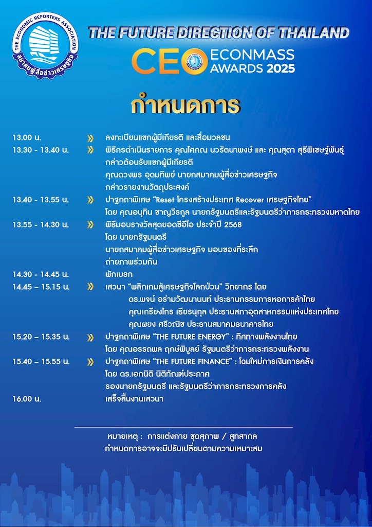 สำหรับงานมอบรางวัลสุดยอดผู้นำองค์กร “CEO Econmass Awards 2025” และงานสัมมนาใหญ่เศรษฐกิจไทย ประจำปี 2568 จะจัดขึ้นในวันที่ 8 ตุลาคม 2568 ณ โรงละครอักษรา คิง เพาเวอร์ กรุงเทพฯ ตั้งแต่เวลา 13.00 น.