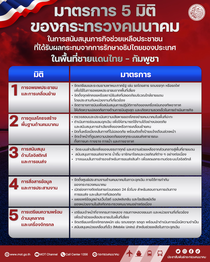 นายสุริยะ จึงรุ่งเรืองกิจ รองนายกรัฐมนตรีและรัฐมนตรีว่าการกระทรวงคมนาคม เปิดเผยว่า สถานการณ์บริเวณชายแดนไทย – กัมพูชา เป็นเรื่องที่รัฐบาลและทุกหน่วยงานให้ความสำคัญอย่างยิ่ง ในฐานะรัฐมนตรีว่าการกระทรวงคมนาคมขอให้ทุกท่านมั่นใจว่า กระทรวงคมนาคมพร้อมสนับสนุนภารกิจ และเคียงข้างดูแลพี่น้องประชาชนที่ได้รับผลกระทบอย่างเต็มกำลัง กระทรวงคมนาคมได้ออกมาตรการใน 5 มิติ เพื่อให้ทุกหน่วยงานในสังกัดสนับสนุนภารกิจช่วยเหลือพี่น้องประชาชนที่ได้รับผลกระทบจากการรักษาอธิปไตยของประเทศในพื้นที่ชายแดนไทย – กัมพูชา ดังนี้ มิติที่ 1 การอพยพประชาชนและการเคลื่อนย้าย ให้จัดเตรียม และระดมยานพาหนะภาครัฐ เช่น รถโดยสาร รถบรรทุก หรือรถไฟ เพื่อใช้ในการอพยพประชาชนจากพื้นที่เสี่ยง พร้อมจัดตั้งจุดพักคอยหรือสถานีรับ – ส่งที่ปลอดภัยบริเวณใกล้ชายแดน โดยประสานกับหน่วยงานที่เกี่ยวข้อง และจัดตารางการบินเพื่อสนับสนุนการปฏิบัติภารกิจของเครื่องบินกองทัพอากาศให้เกิดความปลอดภัยทางด้านการบินสูงสุด และเกิดความรวดเร็วในการดำเนินภารกิจ
