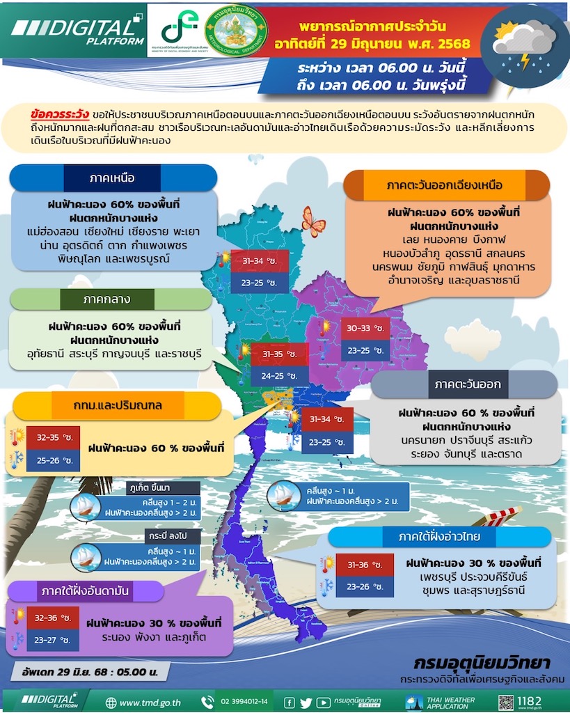 วันนี้ (29 มิ.ย.) กรมอุตุนิยมวิทยา ได้พยากรณ์อากาศ 24 ชั่วโมงข้างหน้า ภาคเหนือและภาคตะวันออกเฉียงเหนือตอนบนมีฝนฟ้าคะนองกระจายและมีฝนตกหนักบางแห่ง ในขณะที่ภาคตะวันออกเฉียงเหนือตอนล่าง ภาคกลาง และภาคตะวันออก เริ่มมีฝนลดลง แต่ยังคงมีฝนตกหนักบางแห่ง ส่วนภาคใต้มีฝนฟ้าคะนองบางพื้นที่ ขอให้ประชาชนบริเวณภาคเหนือตอนบน และภาคตะวันออกเฉียงเหนือตอนบน ระวังอันตรายจากฝนตกหนักและฝนที่ตกสะสม ทั้งนี้เนื่องจากมรสุมตะวันตกเฉียงใต้ที่พัดปกคลุมทะเลอันดามัน ประเทศไทย และอ่าวไทยมีกำลังปานกลาง ประกอบกับมีหย่อมความกดอากาศต่ำบริเวณประเทศเวียดนามตอนบน