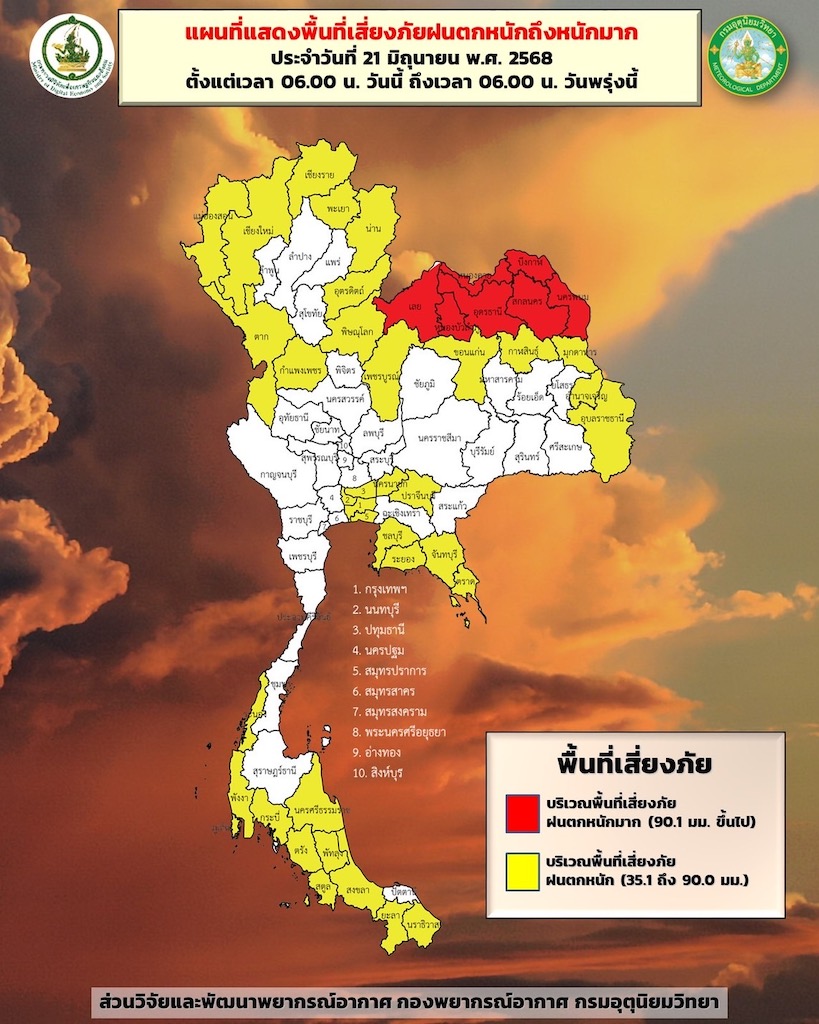 กรมอุตุนิยมวิทยา ได้พยากรณ์อากาศ 24 ชั่วโมงข้างหน้า ตั้งแต่ 06.00 น.วันนี้ (21มิ.ย.68)-เวลา 06.00 น. วันพรุ่งนี้ (22 มิ.ย.68 ประเทศไทยจะมีฝนเพิ่มขึ้น และมีฝนตกหนักบางแห่งบริเวณภาคเหนือ ภาคตะวันออก และภาคใต้ โดยมีฝนตกหนักมากบางพื้นที่บริเวณภาคตะวันออกเฉียงเหนือ ขอให้ประชาชนบริเวณดังกล่าวระวังอันตรายจากฝนตกหนักและฝนที่ตกสะสม ทั้งนี้เนื่องจากมรสุมตะวันตกเฉียงใต้ที่พัดปกคลุมทะเลอันดามัน ประเทศไทย และอ่าวไทย มีกำลังแรงขึ้น ประกอบกับมีหย่อมความกดอากาศต่ำปกคลุมประเทศเวียดนามตอนบน