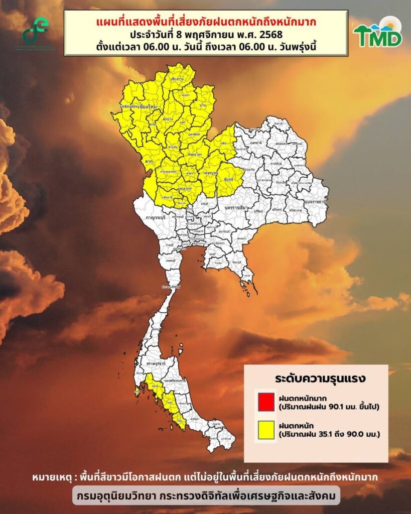 กรมอุตุนิยมวิทยา ได้พยากรณ์อากาศ 24 ชั่วโมงข้างหน้า (8 พ.ย. 68) ภาคเหนือ ภาคตะวันออกเฉียงเหนือด้านตะวันตก ภาคกลาง และภาคตะวันออก มีฝนตกหนักบางแห่ง โดยเฉพาะบริเวณจังหวัด แม่ฮ่องสอน เชียงใหม่ เชียงราย ลำพูน ลำปาง สุโขทัย ตาก และกำแพงเพชร เนื่องจากหย่อมความกดอากาศต่ำที่อ่อนกำลังลงจากพายุ “คัลแมกี” (KALMAEGI) ปกคลุมบริเวณ ด้านตะวันตกของภาคตะวันออกเฉียงเหนือ และมีแนวโน้มจะเคลื่อนผ่านภาคกลางตอนบน และภาคเหนือ ตามลำดับ ขอให้ประชาชนในบริเวณดังกล่าวระวังอันตราย จากฝนตกหนักและฝนที่ตกสะสม ซึ่งอาจทำให้เกิดน้ำท่วมฉับพลัน น้ำป่าไหลหลาก และน้ำล้นตลิ่ง โดยเฉพาะพื้นที่ลาดเชิงเขาใกล้ทางน้ำไหลผ่าน พื้นที่ลุ่ม และพื้นที่น้ำท่วมขัง ส่วนเกษตรกรควรป้องกันและระวังความเสียหายที่จะเกิดต่อผลผลิตทางการเกษตร