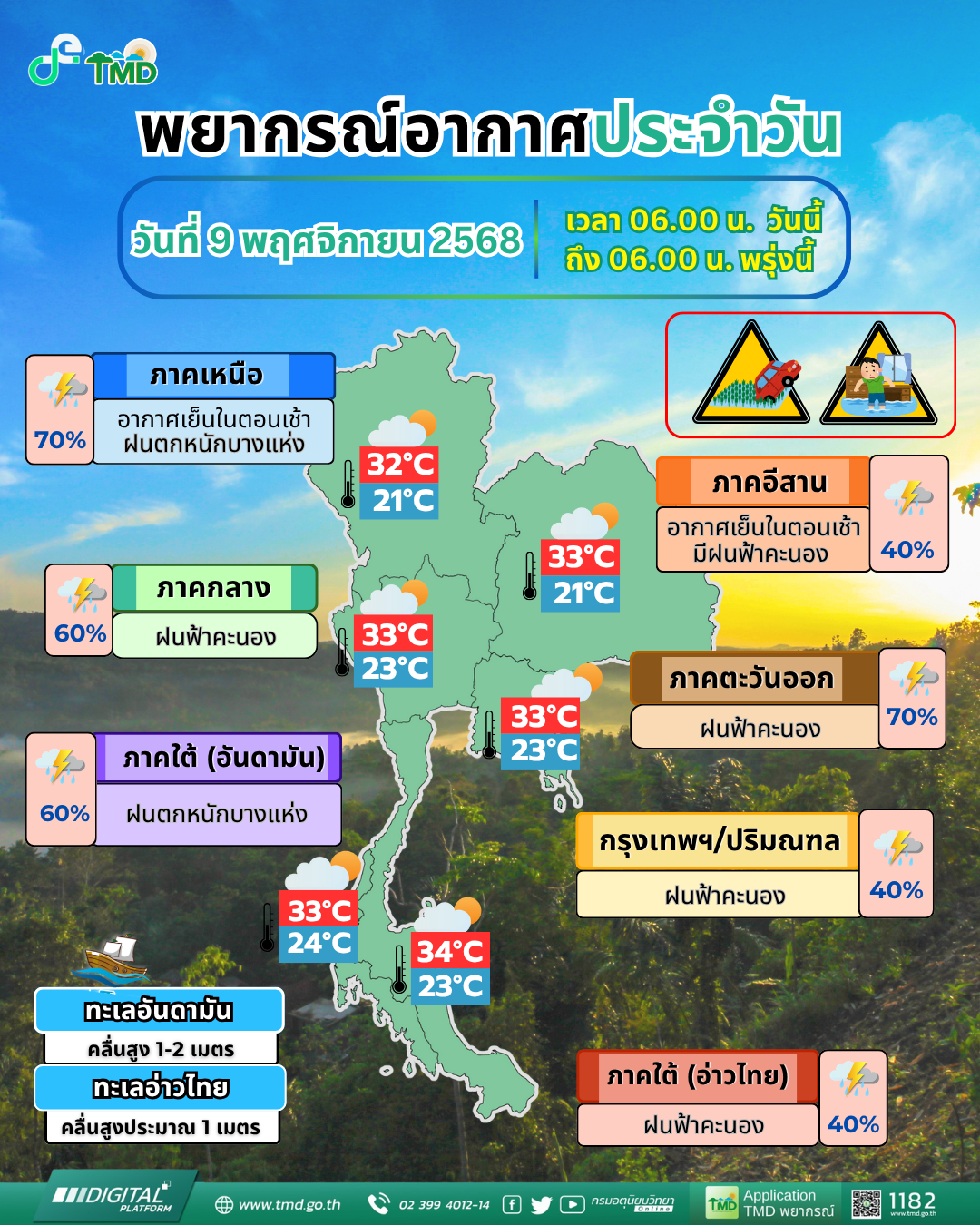 กรมอุตุนิยมวิทยา ได้พยากรณ์อากาศ 24 ชั่วโมงข้างหน้า ตั้งแต่เวลา 06:00 น. วันนี้ (9 พ.ย.68) ถึง 06:00 น. วันพรุ่งนี้ (10 พ.ย.68) ภาคเหนือมีฝนตกหนักบางแห่ง โดยเฉพาะบริเวณจังหวัดแม่ฮ่องสอน เชียงใหม่ เชียงราย ลำพูน ลำปาง พะเยา และตาก เนื่องจากหย่อมความกดอากาศต่ำปกคลุมด้านตะวันตกของภาคเหนือและประเทศเมียนมา ขอให้ประชาชนในบริเวณดังกล่าวระวังอันตรายจากฝนตกหนักและฝนที่ตกสะสมซึ่งอาจทำให้เกิดน้ำท่วมฉับพลัน น้ำป่าไหลหลาก และน้ำล้นตลิ่ง โดยเฉพาะพื้นที่ลาดเชิงเขาใกล้ทางน้ำไหลผ่าน พื้นที่ลุ่ม และพื้นที่น้ำท่วมขัง ส่วนเกษตรกรควรป้องกันและระวังความเสียหายที่จะเกิดต่อผลผลิตทางการเกษตร
