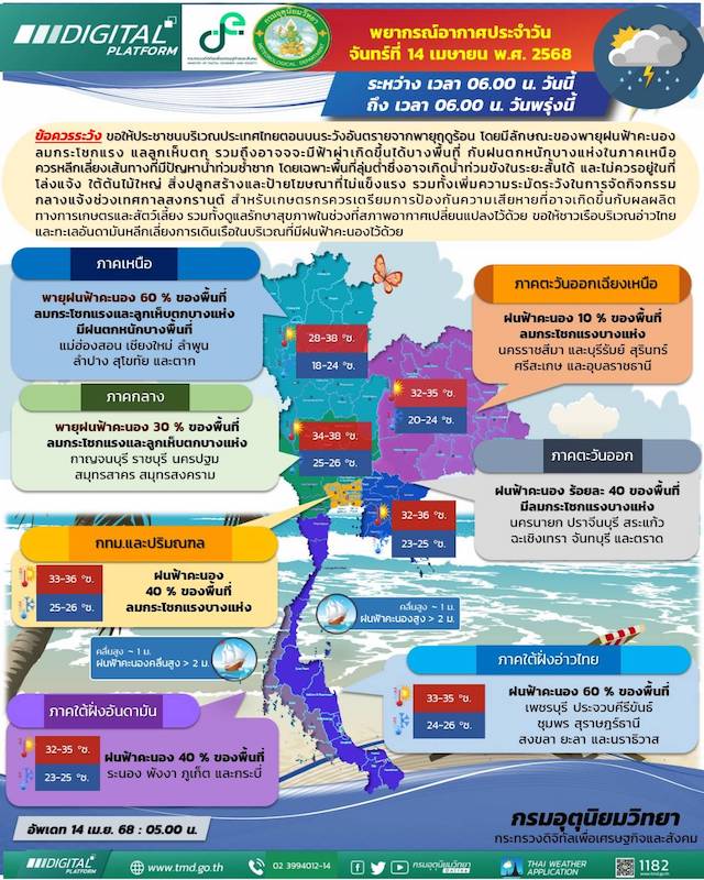 กรมอุตุนิยมวิทยา ได้พยากรณ์อากาศ 24 ชั่วโมงข้างหน้า ตั้งแต่เวลา 06:00 น. วันนี้ (14 เม.ย.) ถึง 06:00 น. วันพรุ่งนี้ (15 เม.ย.) ภาคเหนือและภาคกลาง ยังคงมีพายุฤดูร้อนเกิดขึ้น โดยมีลักษณะของพายุฝนฟ้าคะนอง ลมกระโชกแรง และลูกเห็บตก รวมถึงอาจมีฟ้าผ่าเกิดขึ้นได้บางพื้นที่ กับมีฝนตกหนักบางแห่งในภาคเหนือ ขอให้ประชาชนบริเวณดังกล่าว ระวังอันตรายจากพายุฤดูร้อนและฝนตกหนักที่จะเกิดขึ้น ควรหลีกเลี่ยงเส้นทางที่มีปัญหาน้ำท่วมซ้ำซาก โดยเฉพาะพื้นที่ลุ่มต่ำซึ่งอาจเกิดน้ำท่วมขังในระยะสั้นได้ และไม่ควรอยู่ในที่โล่งแจ้ง ใต้ต้นไม้ใหญ่ สิ่งปลูกสร้างและป้ายโฆษณาที่ไม่แข็งแรง