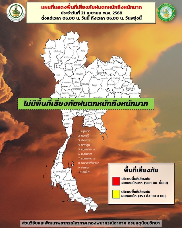กรมอุตุนิยมวิทยา ได้พยากรณ์อากาศ 24 ชั่วโมงข้างหน้า ตั้งแต่เวลา 06.00 น. วันนี้ (21 เม.ย.68)-เวลา 06.00 น.วันพรุ่งนี้ (22 เม.ย.) ประเทศไทยตอนบนมีอากาศร้อนโดยทั่วไป และมีอากาศร้อนจัดบางพื้นที่ โดยมีฝนฟ้าคะนอง กับมีลมกระโชกแรงบางแห่ง ขอให้ประชาชนในบริเวณดังกล่าวระวังอันตรายจากฝนฟ้าคะนองกับลมกระโชกแรงที่อาจจะเกิดขึ้นบางพื้นที่ รวมทั้งดูแลรักษาสุขภาพเนื่องจากสภาพอากาศที่ร้อนไว้ด้วย ทั้งนี้เนื่องจากความกดอากาศต่ำเนื่องจากความร้อนปกคลุมประเทศไทยตอนบน ประกอบกับมีลมใต้และลมตะวันตกเฉียงใต้พัดปกคลุมบริเวณดังกล่าว