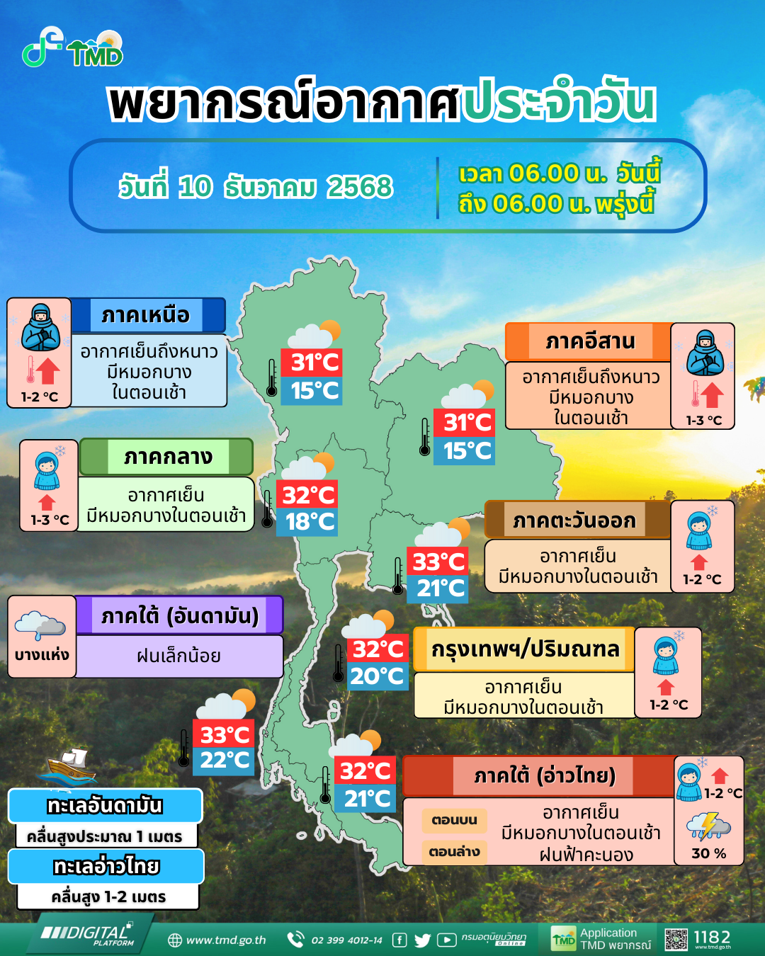 กรมอุตุนิยมวิทยา ได้พยากรณ์อากาศ 24 ชั่วโมงข้างหน้า ตั้งแต่เวลา 06:00 น. วันนี้ (10ธ.ค.68) ถึง 06:00 น. วันพรุ่งนี้ (11ธ.ค.68) ประเทศไทยตอนบนมีอุณหภูมิสูงขึ้นกับมีหมอกบางในตอนเช้า แต่ยังคงมีอากาศเย็นถึงหนาว ขอให้ประชาชนดูแลรักษาสุขภาพเนื่องจากสภาพอากาศที่หนาวเย็น และเพิ่มความระมัดระวังในการสัญจรผ่านบริเวณที่มีหมอก รวมถึงระวังอันตรายจากอัคคีภัยที่อาจเกิดขึ้นจากสภาพอากาศแห้ง ทั้งนี้เนื่องจากบริเวณความกดอากาศสูงหรือมวลอากาศเย็นที่ปกคลุมประเทศไทยตอนบนเริ่มมีกำลังอ่อนลง